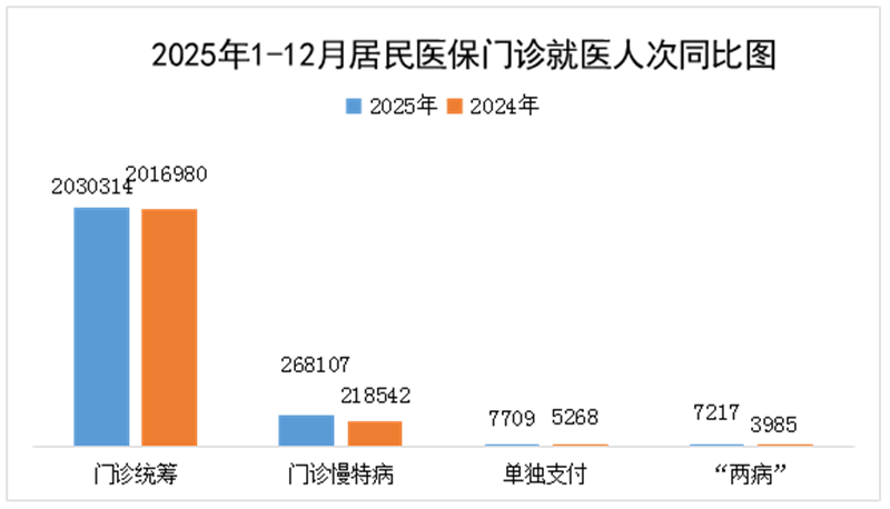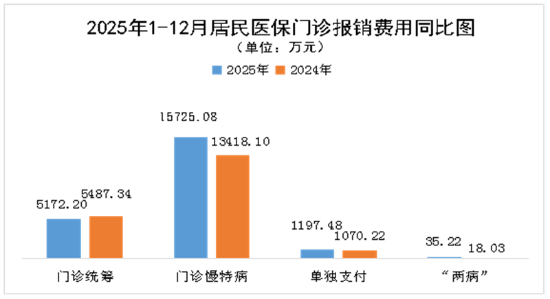 2025年1-12月,全市城乡居民医保门诊医疗总费用共计42576.02万元(去年同期37838.82万元),同比增长12.52%;报销总金额为22129.98万元(去年同期19993.69万元),同比增长10.68%。