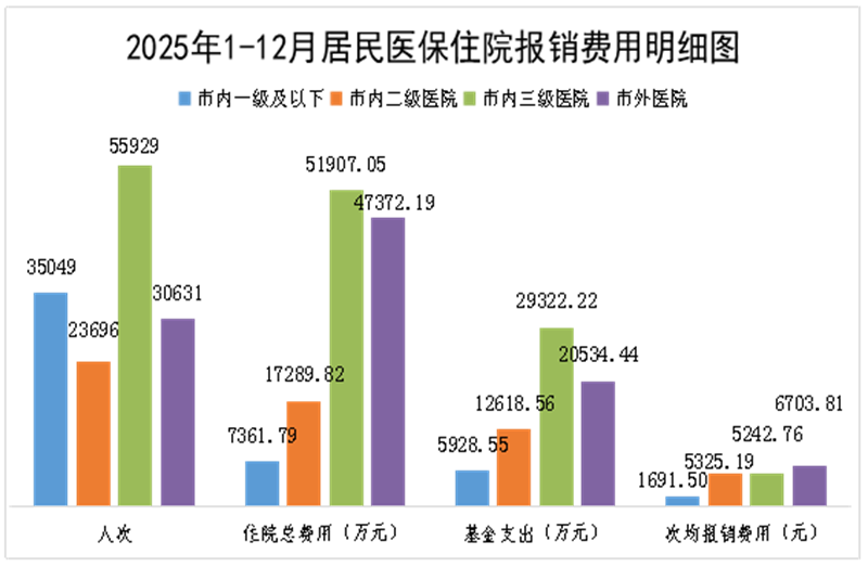 2025年1-12月,市内三级医疗机构住院55929人次(去年同期53037人次),同比增长5.45%。住院总费用51907.05万元(去年同期52971.20万元),同比下降2.01%。次均住院费用9280.88元(去年同期9987.59元),同比下降7.08%。报销总金额为29322.22万元(去年同期30223.51万元),同比下降2.98%。次均住院费用报销金额为5242.76元(去年同期5698.57元),同比下降8.00%,政策范围内费用报销比例为63.61%(去年同期63.65%),下降0.04%。